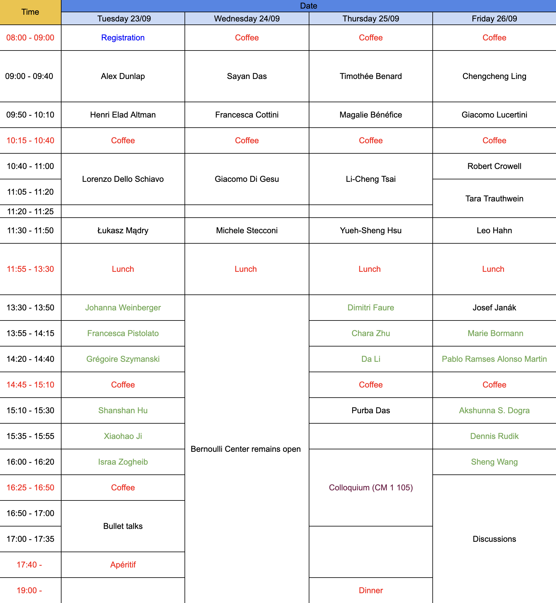 This workshop (workshop homepage) provides a platform for young researchers in mathematics, in the field of Probability and Stochastic Analysis, to present their work, engage in discussions, and foster collaboration and idea-sharing in the fields of stochastic analysis and stochastic geometric analysis.
