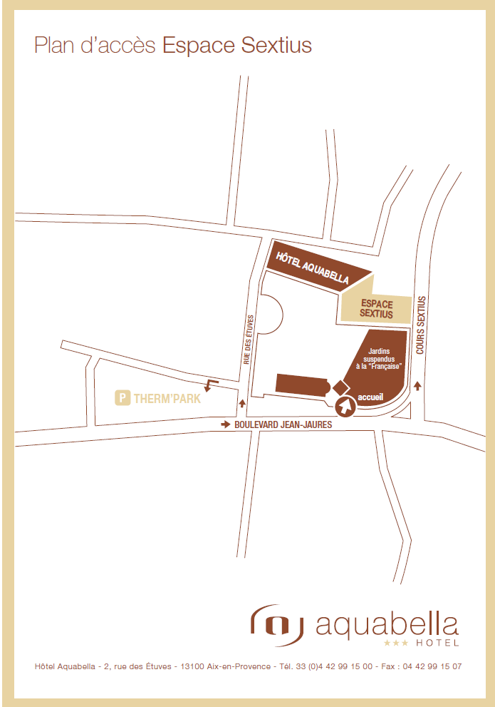 The workshop will be held at the Aquabella Hotel, 2 rue des étuves, at Aix-en-Provence, France. The hotel is located in downtown of Aix-en-Provence.