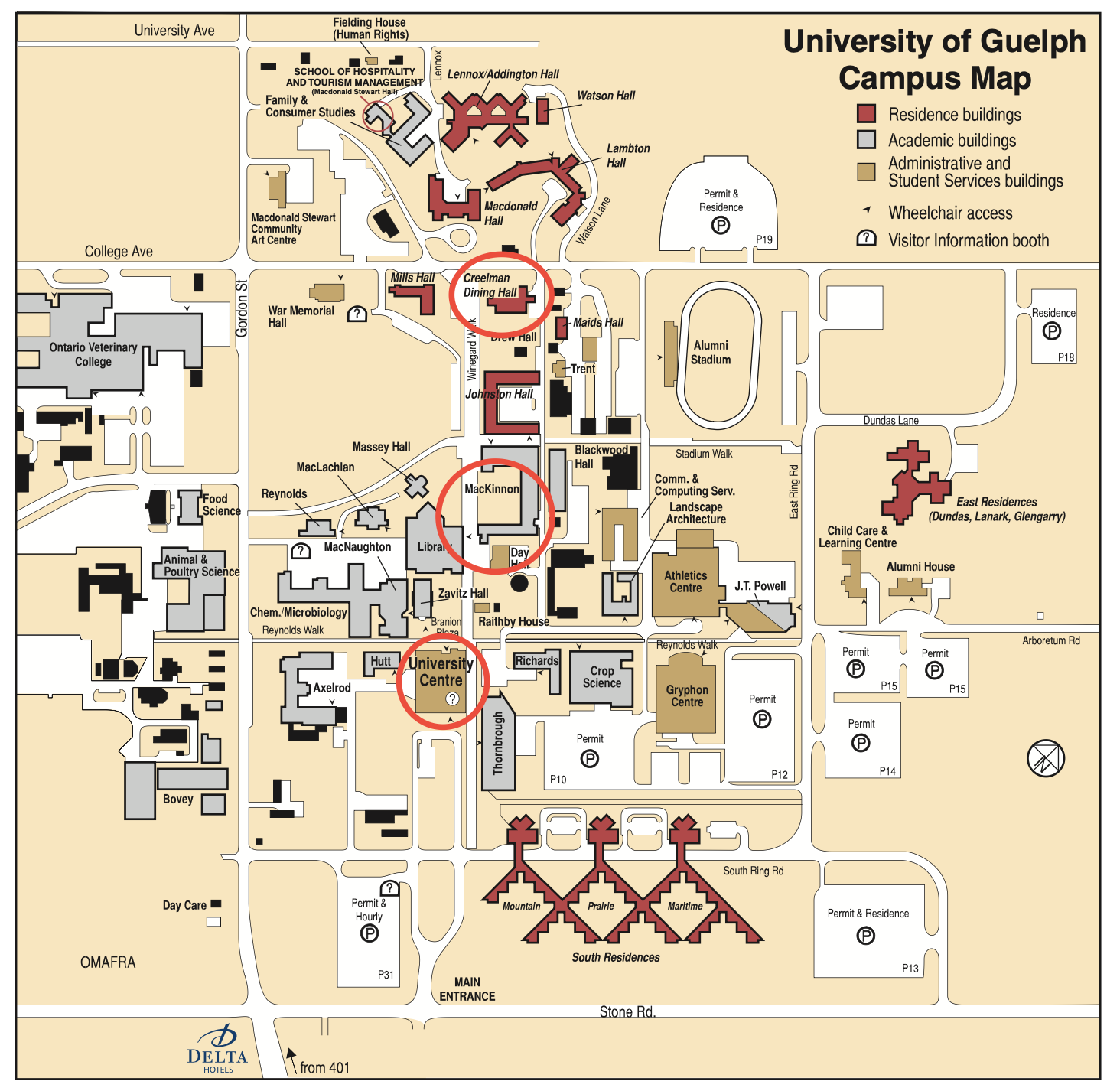Friday: Everything on campus is opened. Creelman Hall and UC Chef's Hall are good places to get a to-go meal with lots of options. Brass Taps and the Bullring are the campus restaurants.