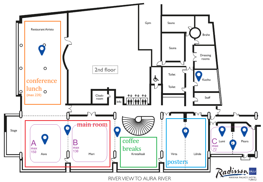 During the lunch break, the main room will get separated into A and B using a divider wall.