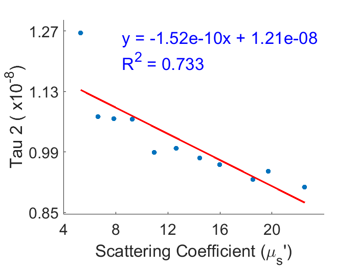 Results: As IL concentration increased, Tau 2 and μ_s^' exhibited negative correlation, with μ_s^' increasing as Tau 2 decreased. R2 of 0.733 demonstrated changes in Tau 2 are strongly correlated with μ_s^'.