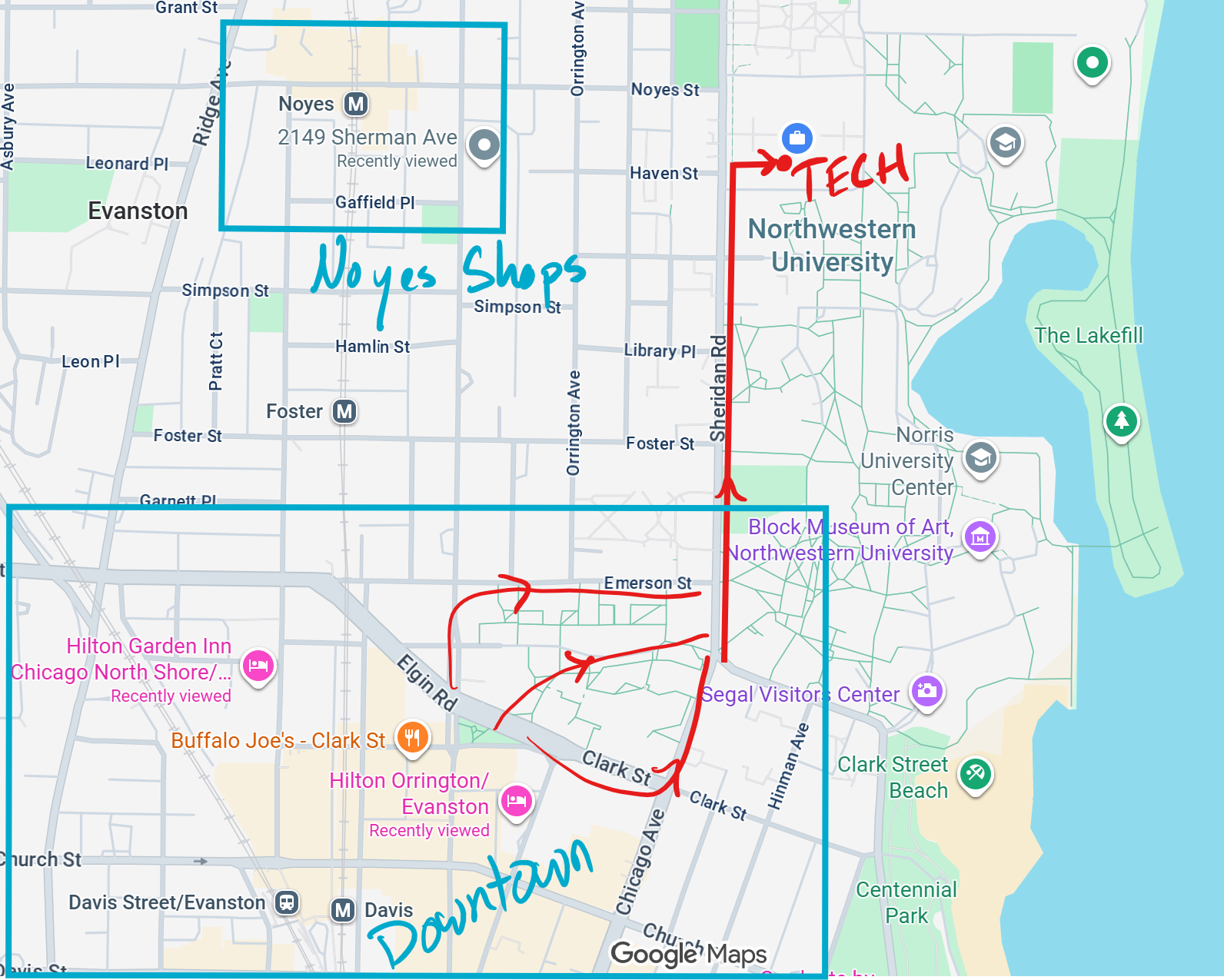 Numerous shops and restaurants are nearby, namely, the Noyes shops (~10 minute walk directly west of the Tech building) and downtown Evanston near the hotels (~10-15 minute walk South).