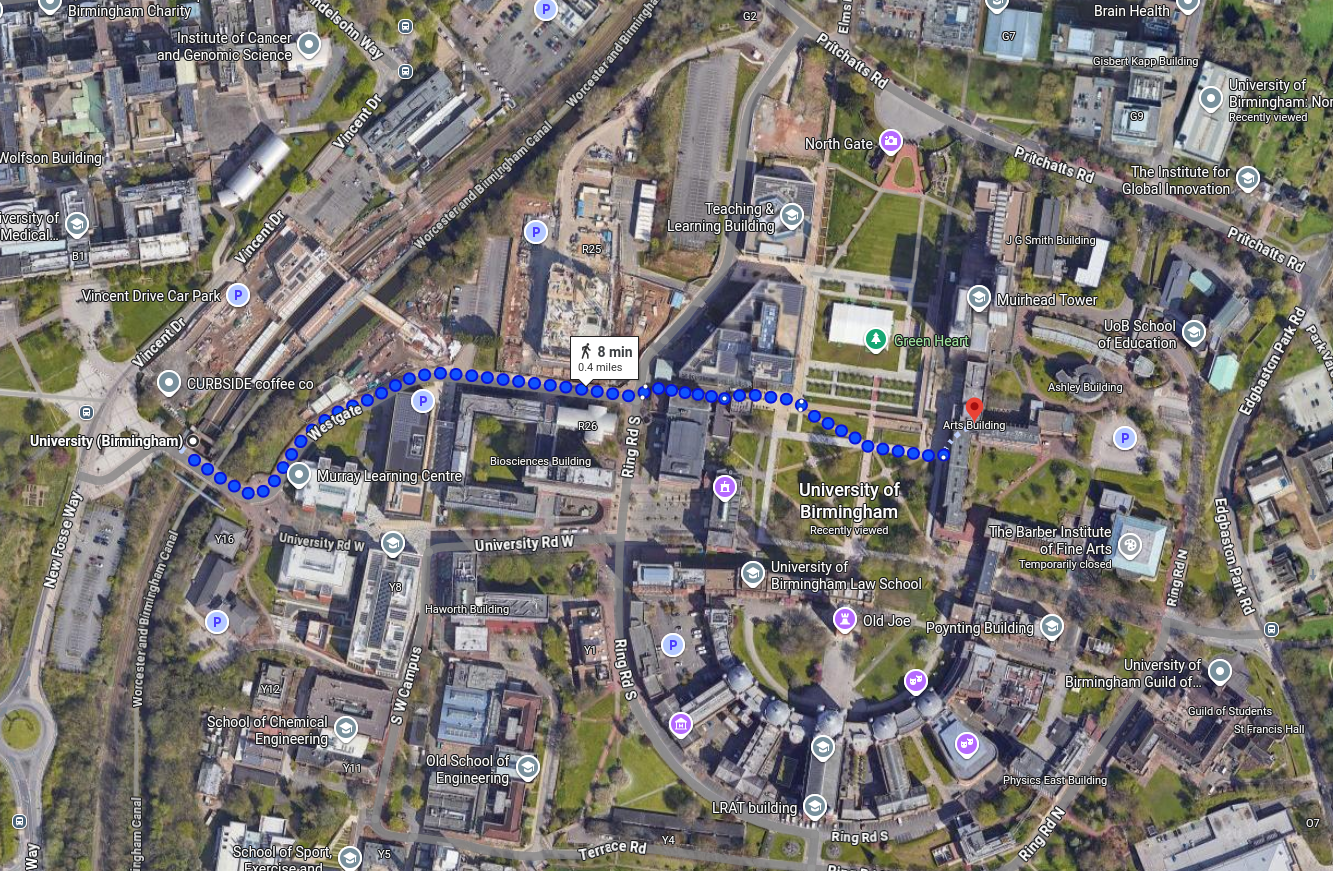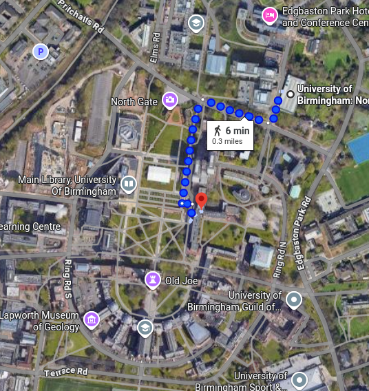 You are welcome to park in the North East Car Park (postcode B15 2SA). The car park is a 5 minute walk from the meeting venue (see below).