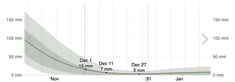 The average rainfall (solid line) accumulated over the course of a sliding 31-day period centered on the day in question, with 25th to 75th and 10th to 90th percentile bands. The thin dotted line is the corresponding average snowfall. [Ref: WeatherSpark.com]
