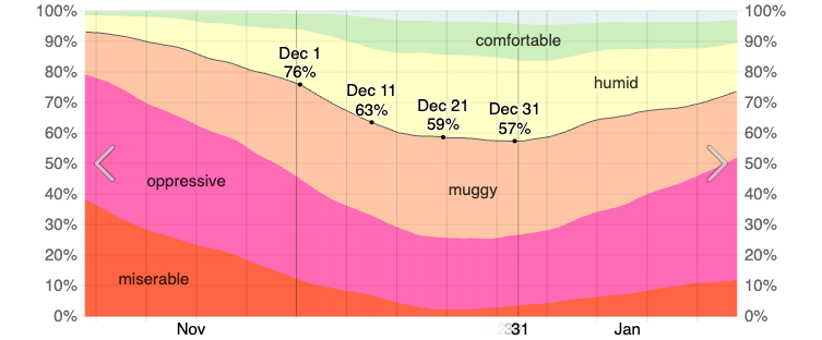 The percentage of time spent at various humidity comfort levels, categorized by dew point. [Ref: WeatherSpark.com]