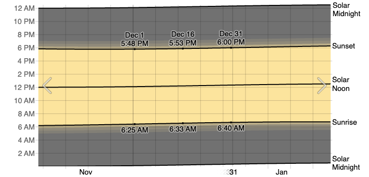 The solar day over the course of December. From bottom to top, the black lines are the previous solar midnight, sunrise, solar noon, sunset, and the next solar midnight. The day, twilights (civil, nautical, and astronomical), and night are indicated by the color bands from yellow to gray. [Ref: WeatherSpark.com]
