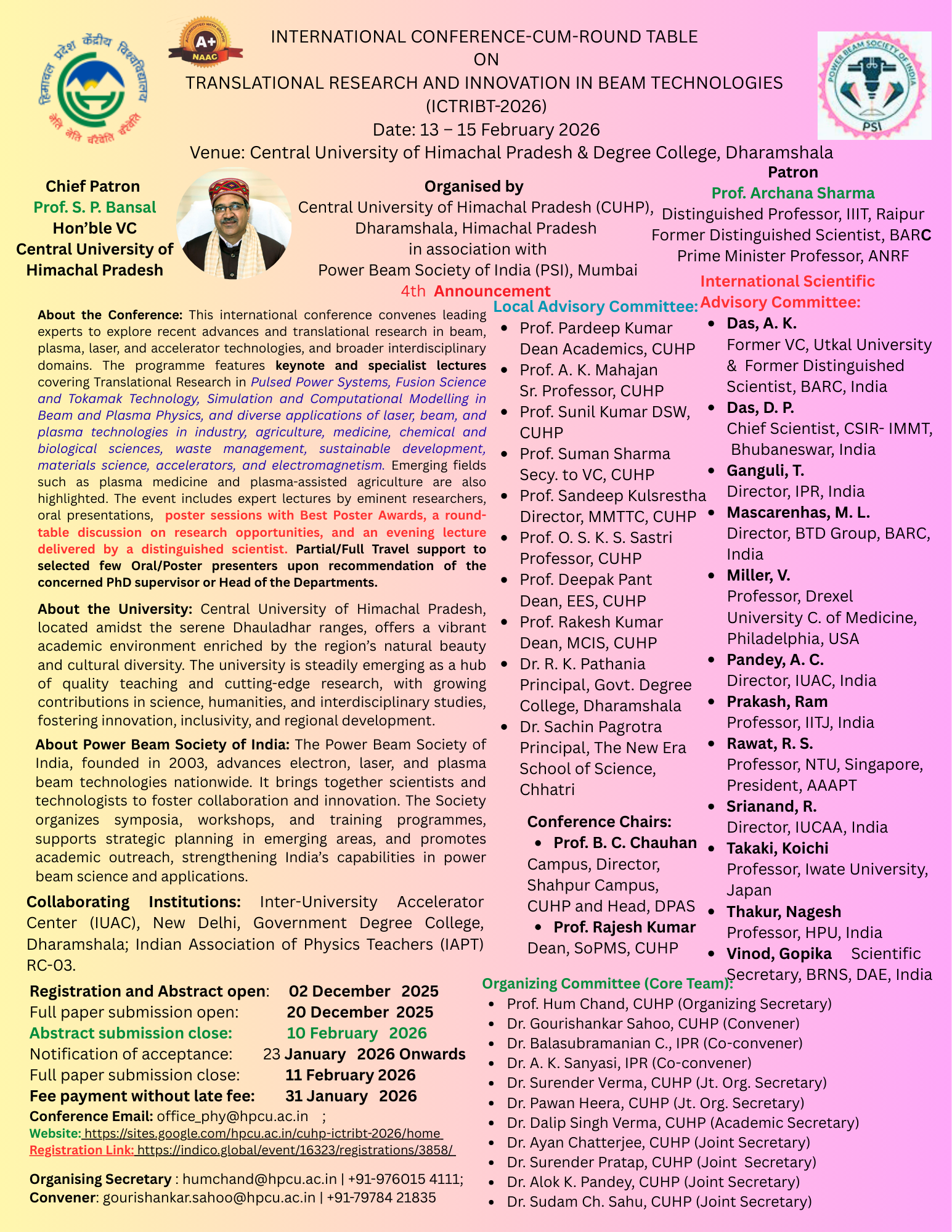 This international conference convenes leading experts to explore recent advances and translational research in beam, plasma, laser, and accelerator technologies, and broader interdisciplinary domains. The programme features keynote and specialist lectures covering Translational Research in Pulsed Power Systems, Fusion Science and Tokamak Technology, Simulation and Computational Modelling in Beam and Plasma Physics, and diverse applications of laser, beam, and plasma technologies in industry, agriculture, medicine, chemical and biological sciences, waste management, sustainable development, materials science, accelerators, and electromagnetism. Emerging fields such as plasma medicine and plasma-assisted agriculture are also highlighted. The event includes expert lectures by eminent researchers, poster sessions with Best Poster Awards, a round-table discussion on research opportunities, and an evening lecture delivered by a distinguished scientist.