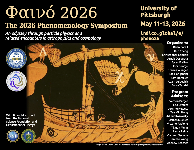 The 2026 Phenomenology Symposium (PHENO) will be held May 11 - 13, 2026 at the University of Pittsburgh. It will cover the latest topics in particle phenomenology and theory as well as related issues in astrophysics and cosmology. We would like to encourage you to register and submit an abstract for a parallel talk. All talks are expected to be in person. We hope to see you in May!
