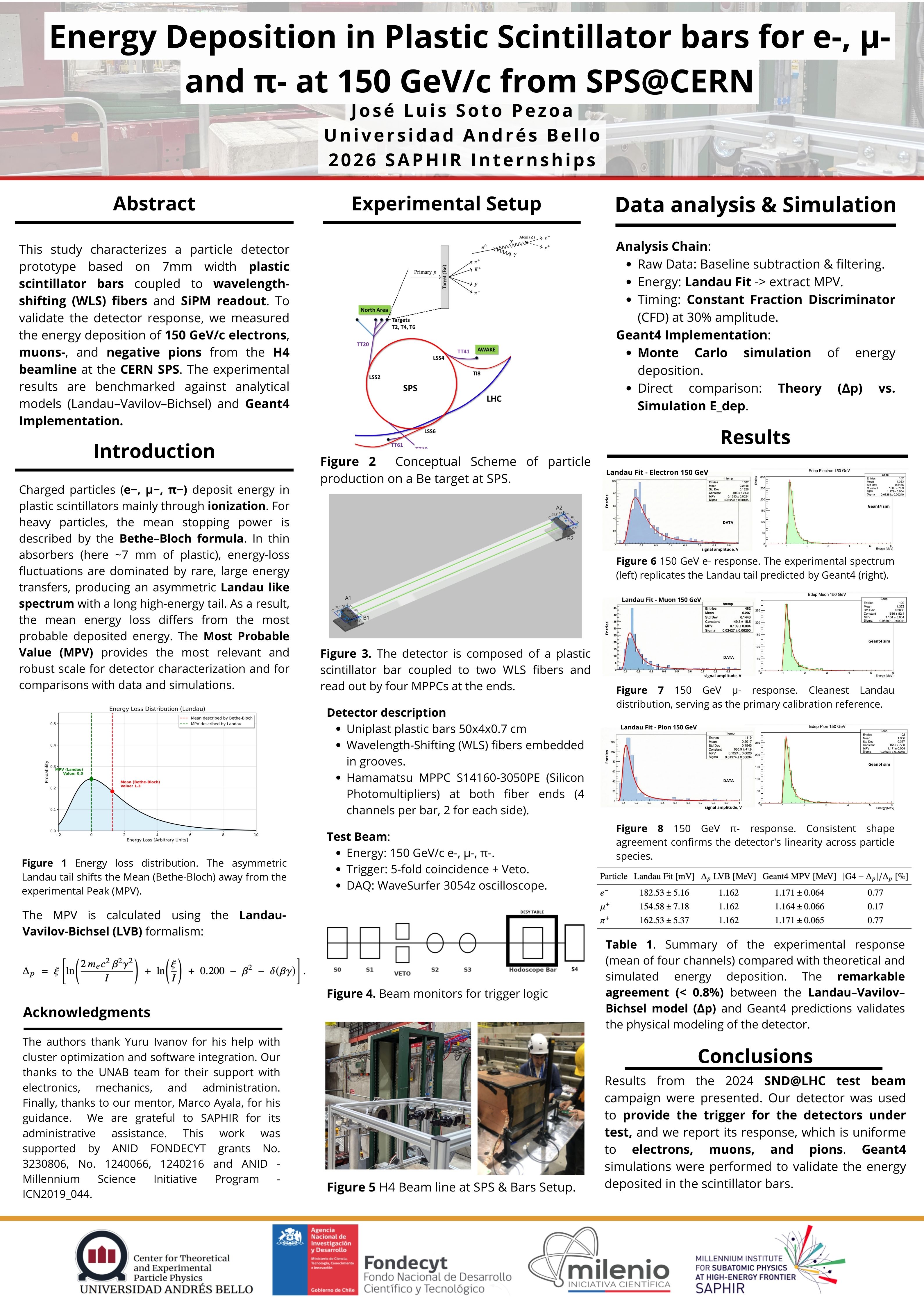 This study characterizes a particle detector prototype based on 7mm width plastic scintillator bars coupled to wavelength-shifting (WLS) fibers and SiPM readout. To validate the detector response, we measured the energy deposition of 150 GeV/c electrons, muons-, and negative pions from the H4 beamline at the CERN SPS. The experimental results are benchmarked against analytical models (Landau–Vavilov–Bichsel) and Geant4 Implementation.