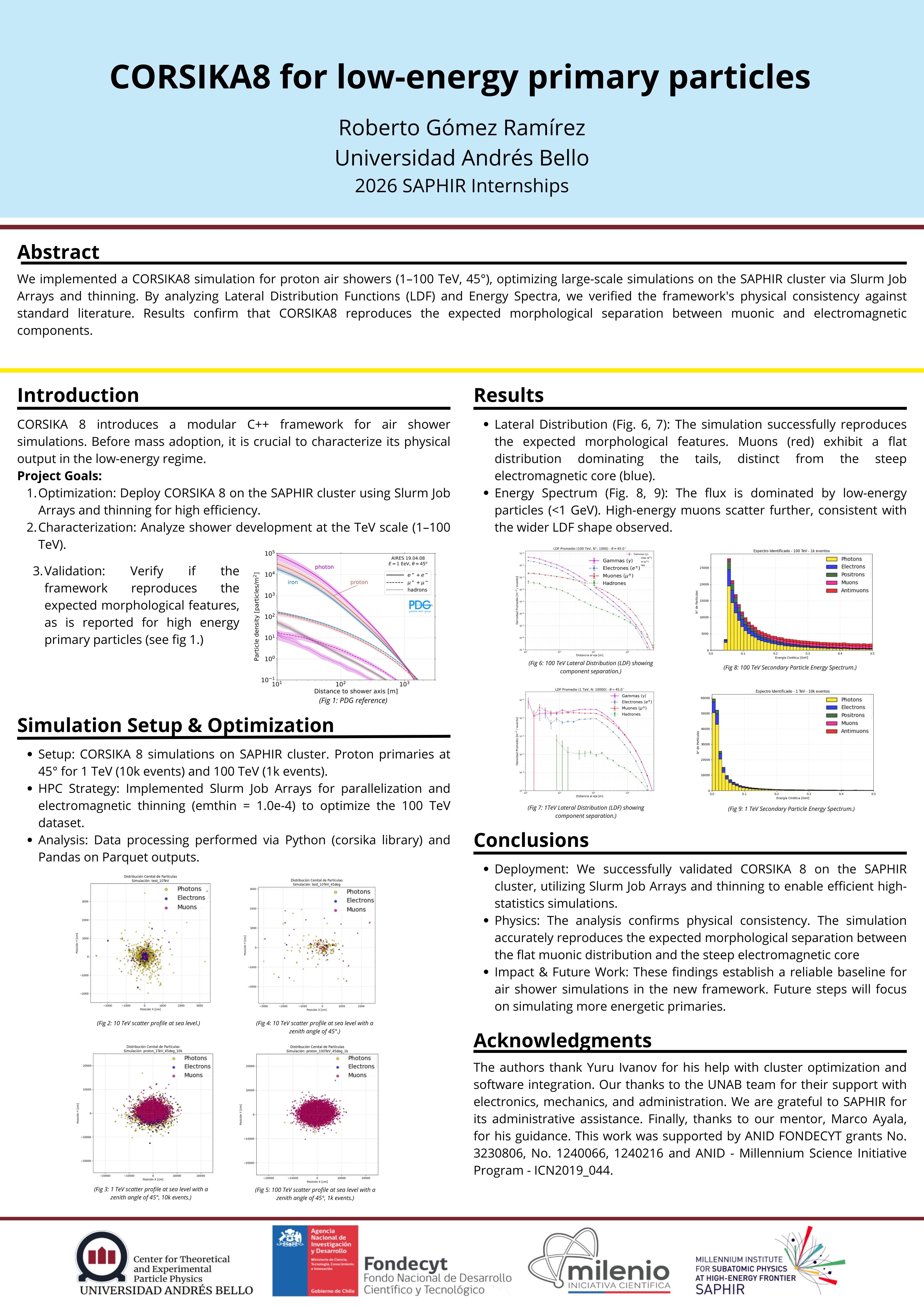 We implemented a CORSIKA8 simulation for proton air showers (1–100 TeV, 45°), optimizing large-scale simulations on the SAPHIR cluster via Slurm Job Arrays and thinning. By analyzing Lateral Distribution Functions (LDF) and Energy Spectra, we verified the framework's physical consistency against standard literature. Results confirm that CORSIKA8 reproduces the expected morphological separation between muonic and electromagnetic components.